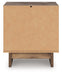 Nostalgic style, retooled for today’s trends. This nightstand puts an elevated twist on mod aesthetics. Its warm brown tones reflect the mid-century vibes you love, while the angular base incorporates contemporary motifs. Whether you're scrolling before bed or setting morning alarms, seamlessly incorporated USB and wireless charging keep devices close. Integrated drawer handles round out the look in sleek style. With this nightstand, you can build your bedroom into a modern haven with a touch of retro-cool flair.