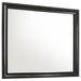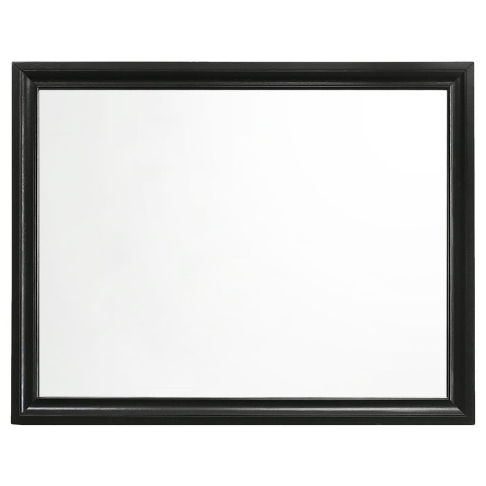 Sparkling trim brings the glamour of diamonds to this five-piece modern bedroom set. Designed to make a statement, it showcases a deep black finish with tuxedo inspired design elements that add glittering allure. The set centers on a chic bed, complete with an upholstered headboard and low footboard that create an airy, inviting pairing. The dresser, chest and nightstand each add ample storage, perfect for an organized bedroom ambiance. Each piece is complete with sparkling trim and jewelry inspired bar pulls on its drawer fronts that pull the look together perfectly.
