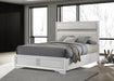 Introduce a little bit of glam flair to your bedroom with a modern upholstered bed. Featuring padded white fabric panels, the headboard is complete with molded trim and a horizontal stripe that glitters in the light. A matching vertical stripe on the low footboard is the perfect complement. A white finish is lightly textured on the panel footboard and rails, while trim is smooth and cool. The bed is complete with slats and center legs for added support and requires a foundation.