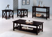 This 3-piece occasional table set includes a coffee table and two end tables, ideal for a living room or lounge. Constructed from hardwood, engineered wood, and rubberwood veneer, this set showcases a rich dark merlot finish. Each piece is designed with a lower shelf for extra storage space, while the X-shaped accents on the sides add a touch of visual appeal. This coffee table set is a perfect combination of form and function for your home.