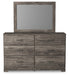 | Details | Made with engineered wood (MDF/particleboard) and decorative laminate, Rustic warm gray finish over replicated oak grain with authentic touch, 6 smooth-gliding drawers, Large scale pewter-tone handles, Mirror attaches to back of dresser, Assembly required | |