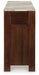 | Details | Made with mango wood solids, engineered wood and veneer, Dark brown finish, Taupe, white and gray marble top, Doors with rounded wood bar pulls, 4 sliding doors, 2 shelves, Color variations, fissures, mineral deposits and veining in the marble top are naturally formed characteristics | |