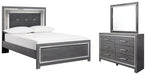 | Details | B214B1: Made of engineered wood (MDF/particleboard) and decorative laminate, Gray finish with replicated wood grain, Faceted chrome-tone pulls and accents, 6 smooth-operating drawers, Drawers lined with faux linen laminate, Mirror attaches to back of dresser, Includes tipover restraint device, Assembly required, B214B4: Includes headboard, footboard and side rails, Made of engineered wood (MDF/particleboard) and decorative laminate, Gray finish with replicated wood grain, Faux leather upholstery, Faux crystal and faceted chrome-tone metal accents, Accent LED lights with remote to control color and brightness, Power cord included; UL Listed, Mattress and foundation/box spring available, sold separately, Assembly required, Bed is compatible with an adjustable base, | |