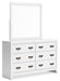 | Details | B427B9: Includes California king panel headboard, footboard, rails and slats, Made with hardwood solids, okoume veneer and MDF substrates, White finish, Foundation/box spring required, sold separately, Mattress available, sold separately, Assembly required, B427B1: Includes dresser and mirror, Made with hardwood solids, okoume veneer and MDF substrates, White finish, 6 drawers with dovetail construction and metal center guides, Hardware with dark finish, Drawer interiors are lined with a wood grain laminate for a clean, finished look, Mirror attaches to back of dresser, | |