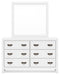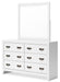 Details B427B6: Includes queen panel headboard, footboard, rails and slats, Made with hardwood solids, okoume veneer and MDF substrates, White finish, Foundation/box spring required, sold separately, Mattress available, sold separately, Assembly required, B427B1: Includes dresser and mirror, Made with hardwood solids, okoume veneer and MDF substrates, White finish, 6 drawers with dovetail construction and metal center guides, Hardware with dark finish, Drawer interiors are lined with a wood grain laminate for a clean, finished look, Mirror attaches to back of dresser, B427-92: Made with hardwood solids, okoume veneer and MDF substrates, White finish, 2 drawers with dovetail construction and metal center guides, Hardware with dark finish, Drawer interiors are lined with a clean wood grain laminate for a clean, finished look,
