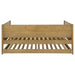 The transitional-style panel daybed with trundle features a natural brown finish that highlights its rustic charm and versatile appeal. Constructed from pine wood, plywood, MDF, and pine veneer, this piece combines durability with timeless design. The natural wood variations, interacting with the applied finish, make each piece truly unique. Included slats provide sturdy mattress support, while the trundle, equipped with four wheels, glides smoothly for convenient additional sleeping space.