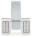 | Details | Includes vanity and mirror, Made with solid wood components, MDF substrate and decorative PVC laminate, Bright white lacquer finish, Vertical metal drawer pulls, Built-in LED lighting with 3-way dimmer switch, 3 drawers with fully finished interiors, English dovetail construction and heavy-duty ball-bearing side glides, Drawers with rhinestone frames; textured laminate drawer fronts, 110V power supply with USB-A and USB-C charging ports, Power cord included; UL Listed, Mirror with rhinestone frame; attaches to back of dresser | |