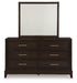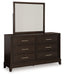 Details B618B2: Includes upholstered panel headboard, panel rails and panel footboard with slats, Made with hardwood solids, engineered wood and MDF substrates, Grayish brown wood-tone finish, Floating inset upholstered panel in polyester Next-Gen Nuvella fabric surrounded by LED backlight, Next-Gen Nuvella™ is a performance fabric that is soft, easy to clean, stain-resistant and durable, Clean fabric with mild soap and water, let air dry; for stubborn stains, use a solution of 4 oz. bleach to 28 oz. water, Light switch is located on each side of headboard and includes dual USB charging port (USB-A and USB-C), Power cord included; UL Listed, Foundation/box spring required, sold separately, Mattress available, sold separately, Assembly required, B618B1: Includes dresser and mirror, Made with hardwood solids, engineered wood and MDF substrates, Grayish brown wood-tone finish, Metal bar pulls with satin nickel-tone finish, 6 smooth-gliding drawers with dovetail construction and heavy duty ball-bearing side glides (top drawers felt lined), Mirror attaches to back of dresser, B618-92: Made with hardwood solids, engineered wood and MDF substrates, Grayish brown wood-tone finish, Metal bar pulls with satin nickel-tone finish, 2 smooth-gliding drawers with dovetail construction and heavy duty ball-bearing side glides (top drawers felt lined),