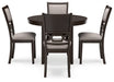 | Details | Includes dining table and 4 upholstered chairs, Table made with rubberwood solids, mindi veneer and MDF substrates, Chair made with wood and engineered wood, Cherry brown finish, Tabletop has reverse diamond patterned veneer, Thick tapered legs, Lower shelf, Chair with light beige polyester upholstery, Foam cushioned seat and backrest, Chair backrest features fretwork accent, Seats up to 4, Assembly required | |