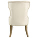 Enjoy an intriguing silhouette with a classic look. Graceful curves and angles form an eye-catching design in this dining chair. Perfect for transitional spaces, its modern design is softened with lovely beige upholstery and tufting on its seat back. Individually hand-applied nailhead trim infuses charm and style. Beautifully contrasting legs in a warm brown finish add a balanced look with curves and tapers.