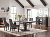 You'll feel proud to offer guests a seat at this dining room set. Inspired by traditional European decor, the table is designed with a spacious rectangular tabletop and a double pedestal base with exquisitely curved accents. Upholstered dining chairs are available in a versatile grey color, which perfectly blends with the color of the table. Find nailhead trim intricately applied to each frame of every dining chair. The chairs are supported on stylish tapered legs to complete their traditional appearance.