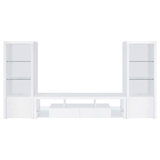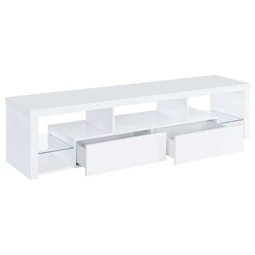 CoasterElevate your entertainment realm with our sleek, modern TV stand. With a pristine glossy white finish and clear glass accents, it exudes elegance. ...