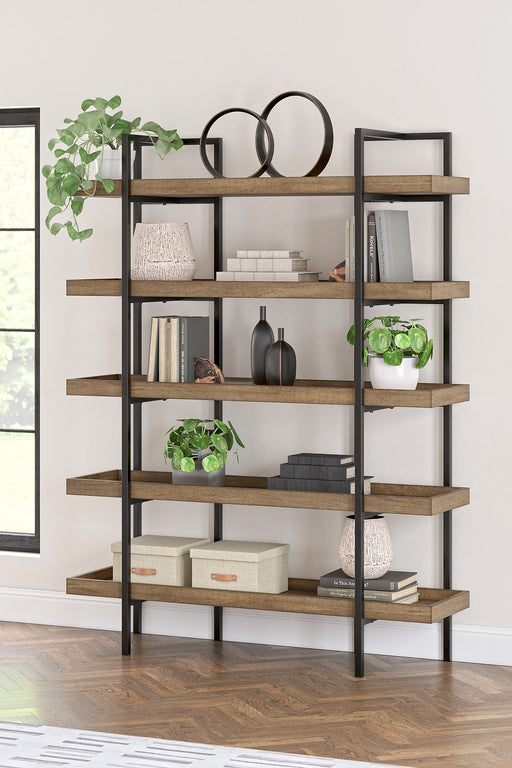 Signature Design by Ashley®With its mixed-material look, this bookcase seamlessly fits into a wide range of modern settings. Five fixed display shelves in a dark brown finish...
