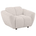 Plush, sculptural, and undeniably bold, this modern sofa set showcases chunky silhouettes wrapped in soft greige chenille. Wide splayed arms frame deep, channel-tufted contours, while attached waterfall seats are built with pocket coil construction for long-lasting support. Textured upholstery adds dimension to the grid-like shaping, offering a refined yet cozy aesthetic. Complete with matching knife-edge accent pillows, this sofa set blends form and function with contemporary ease.