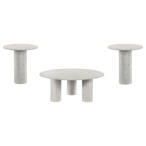CoasterThis coffee table set, featuring a coffee table and end table, showcases genuine white marble surfaces and cylindrical pedestal bases. The fluted a...