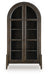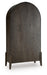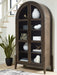 Embrace rustic sophistication with this impressive accent cabinet. Its rough-sawn textured exterior and deep dark brown finish exude warmth and character from top to bottom. Arched doors with glass inserts and oversized pulls open to reveal four shelves—two of them adjustable—giving you the freedom to organize your belongings exactly how you want.