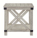 Sporting a distressed whitewash finish, this end table is rustic farmhouse living at its best. Crossbuck styling adds striking flair. Metal industrial brackets incorporate an industrial twist.