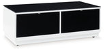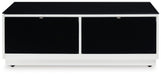 Combining a high-gloss white finish with a black glass tabletop, this coffee table proves opposites really do attract. It's the perfect blend of modern style and functionality, with two roomy drawers for storing essentials and a large open display shelf for decorative items. Want to rearrange the furniture? Casters make it easy to adapt to any situation.