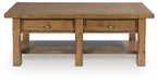 The timeless styling of this coffee table is well-suited to casual and farmhouse-inspired spaces. Its versatile burnished brown finish seamlessly pairs with neutrals and muted tones alike. With drawers for sofa-side storage and a bottom shelf for displaying decor, this chic table beautifully suits everyday living.