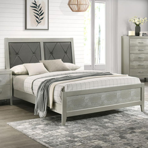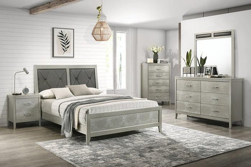 GenerationSILVER EMBOSSED FINISH WITH BUTTON TUFTED INSERT ON HEADBOARD AND UPHOLSTERED ACCENT ON MIRROR
