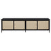 Upgrade your entertainment space with this stunning 78-inch TV stand, designed to accommodate up to an 80-inch TV. Featuring four door cabinets with elegant radio weave polyethylene (PE) rattan fronts, this stand combines modern style with natural texture. The sturdy metal frame, coated with a sleek black powder finish, ensures durability while maintaining a contemporary aesthetic. Inside, two cabinets offer fixed shelving with four total compartments, each equipped with cable access to keep your devices organized and tidy. This TV stand blends style and practicality, making it a perfect addition to any sophisticated living room.