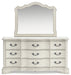 Details Includes dresser and mirror, Made with hardwood solids, spruce veneer, MDF substrates and cast resin components, Antiqued white painted finish, 9 drawers with fully finished interiors, French and English dovetail construction and ball-bearing side glides, Metal bar pulls with aged pewter-tone finish, Mirror attaches to back of dresser