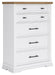 Casual style with substance. This two-tone chest of drawers raises the bar on comfortably cozy design in your soothing sanctuary. A sturdy silhouette with a classic white finish and black metal hardware exudes modern farmhouse vibes. The butcher block oak veneer top adds a relaxed aesthetic. And this charmingly curated piece is spacious enough for all your essentials.