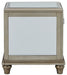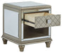 Glamorous, chic and sophisticated. This rectangular end table is made with a metallic silvertone finish, inset beveled mirror panels and drawer pulls adorned with faux crystals. No matter how you style it, this table is a stunning addition to your contemporary decor.