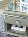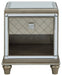 | Details | Made of wood, engineered wood, veneer and mirror, Metallic silvertone finish, Single smooth-gliding drawer, Inset beveled mirror panels, Inset faux crystal adorned pulls, Assembly required | |