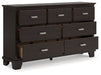 | Details | Made with hardwood solids, engineered wood veneer and MDF substrates, Dark brown finish, Metal bar pulls with bright nickel-tone finish, 7 smooth-gliding drawers with dovetail construction and metal center guides, Drawer interiors are lined with a wood grain laminate for a clean, finished look, Top moulding | |