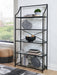 Details Shelves made with clear glass, Metal frame, Frame with antiqued black finish, 5 fixed shelves, Assembly required