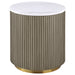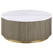 A coffee table set brings cohesive presence to a room with matching round white marble tops, reeded drum bases, and slim metal ring accents. Marble, engineered wood, and metal combine for a balanced mixed-media profile with crisp veining and clean vertical rhythm. This occasional table set creates coordinated surfaces from center to sides, keeping daily essentials close in a living space.