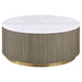 • Greige coffee table features a white marble top, reeded drum base, and gold ring accent