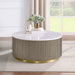 A coffee table makes a bold centerpiece with a round white marble top set on a reeded drum base and slender metal ring. Marble pairs with engineered wood to create a layered look with refined veining and strong vertical texture. Use this cocktail table to anchor seating, keep drinks and books within reach, and create an easy surface for everyday gatherings.