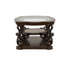 This elegant coffee table blends timeless design with practical functionality. The clear tempered glass top offers durability and a polished look, while the dark bronze powder-coated metal legs add a refined touch. A dark merlot wood finish highlights the engineered wood and cherry veneer construction. The middle shelf features a glossy wooden surface, offering additional display or storage space. Intricate scrollwork detailing enhances the classic appeal, making it a perfect centerpiece for any living room.