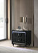 • Two-drawer nightstand fully upholstered in a black velvet for luxe layering