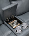 Details U5950415: Dual-sided recliner; middle seat remains stationary, One-touch power control with adjustable positions, Easy View™ adjustable headrest and zero-draw USB port, Zero-draw technology only consumes power when the USB receptacle is in use, Corner-blocked frame with metal reinforced seat, Attached cushions, High-quality foam cushions wrapped in poly fiber, 100% top grain leather covers inside areas such as the back, seat and arm cushions; skillfully matched faux leather covers the remaining areas, Corrected top grain leather with slight embossing, Due to its natural origin, real leather can show individual characteristics such as healed scars, growth marks, grain variation and shade variation, Natural variations make each hide unique and do not detract from the wearing qualities of leather, Power cord included; UL Listed, U5950418: One-touch power control with adjustable positions, Easy View™ adjustable headrest and zero-draw USB port, Zero-draw technology only consumes power when the USB receptacle is in use, Corner-blocked frame with metal reinforced seat, Attached cushions, High-quality foam cushions wrapped in poly fiber, 100% top grain leather covers inside areas such as the back, seat and arm cushions; skillfully matched faux leather covers the remaining areas, Corrected top grain leather with slight embossing, Due to its natural origin, real leather can show individual characteristics such as healed scars, growth marks, grain variation and shade variation, Natural variations make each hide unique and do not detract from the wearing qualities of leather, Center console with 2 cup holders and hidden storage, Power cord included; UL Listed,