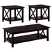 This 3-piece occasional table set includes a coffee table and two end tables, ideal for a living room or lounge. Constructed from hardwood, engineered wood, and rubberwood veneer, this set showcases a rich dark merlot finish. Each piece is designed with a lower shelf for extra storage space, while the X-shaped accents on the sides add a touch of visual appeal. This coffee table set is a perfect combination of form and function for your home.