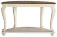 Elevating the art of traditional cottage styling, this demilune sofa table is sure to serve you beautifully for years to come. Antiqued two-tone aesthetic blends a chipped white with a distressed wood finished top for added charm. Classic cabriole legs and shapely lower shelf are a lovely twist. Decorative corbels add refinement.