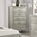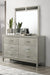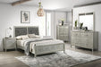 SILVER EMBOSSED FINISH WITH BUTTON TUFTED INSERT ON HEADBOARD AND UPHOLSTERED ACCENT ON MIRROR