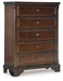 Details Made with hardwood solids, select hardwood veneer and MDF substrate, Warm brown cherry finish, Decorative metal drawer pulls with dark bronze-tone finish, 5 drawers with fully finished interior, dovetail construction and heavy duty ball-bearing side glides