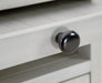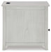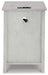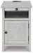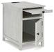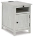 Add big character to a small space with this chairside end table. With its compact size and strong silhouette, it can go anywhere and blend easily into the decor. Less is so much more with the Shaker-inspired design and whitewashed wood grain finish. Loaded with form and function, this end table displays accent pieces and stores essentials securely while keeping devices powered up.