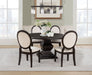 A graceful blend of refinement and comfort, this dining set brings timeless elegance to the heart of your home. The round dining table rests on a sculpted pedestal base, offering a striking silhouette in a rich dark cocoa finish. Matching oval back chairs provide soft cream upholstery with welt-trimmed details, combining plush seating with classical charm. Crafted from rubberwood, engineered wood, and veneer, this set is built for enduring strength and everyday beauty.